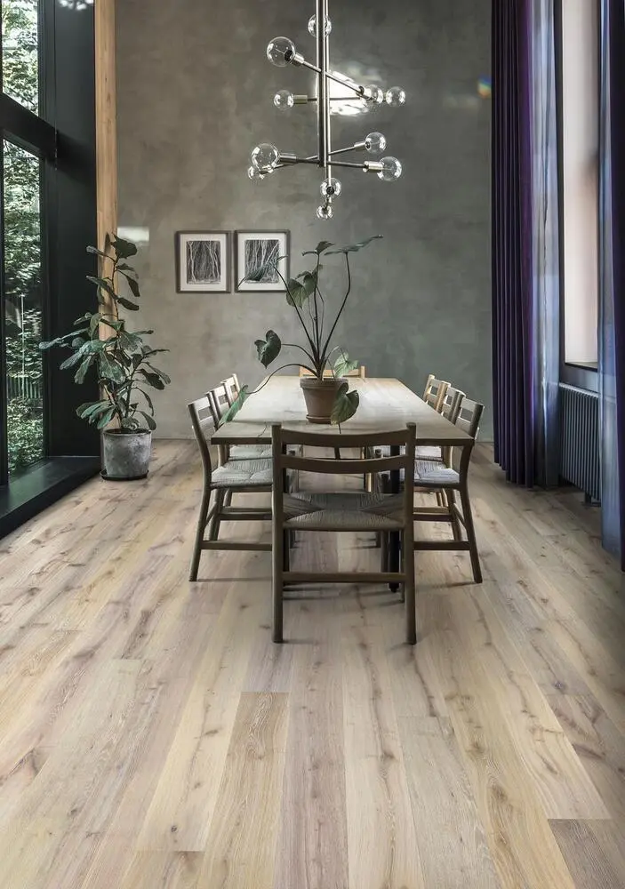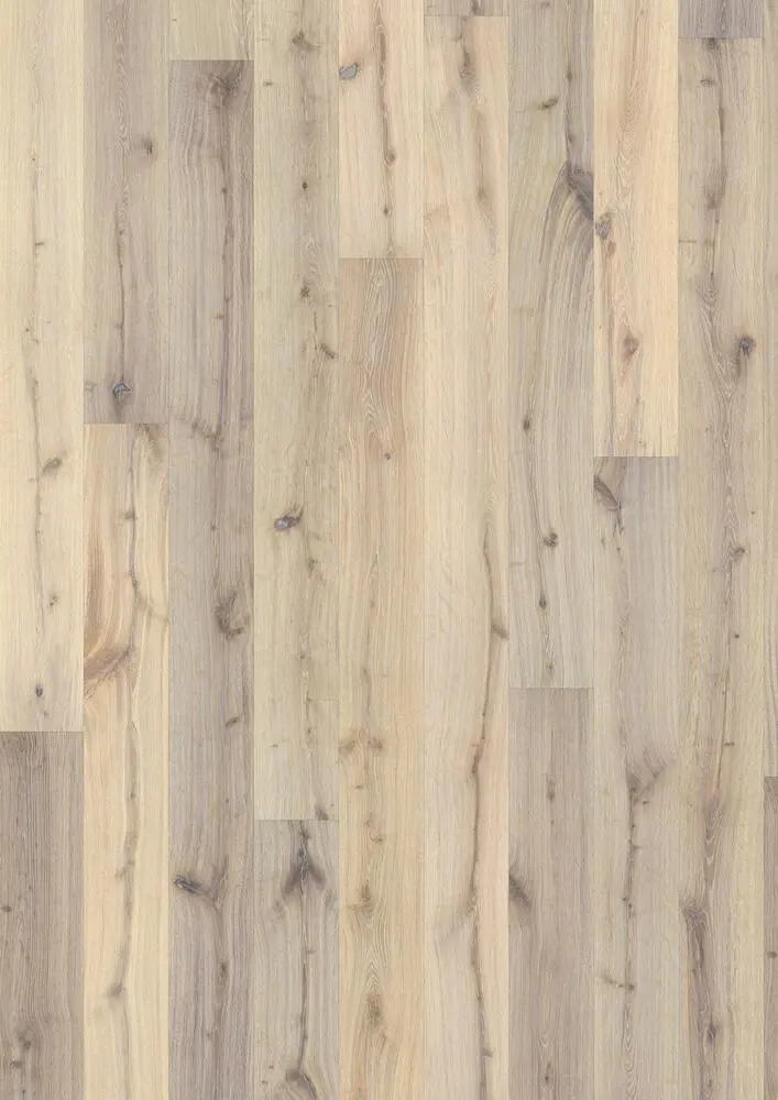 Hienostuneen vaalea sävy täydentyy lämpimän harmailla sävyillä tässä yksilaudaisessa tammilattiossa Boardwalk-kokoelmasta. Erikokoiset elävät oksanpaikat korostuvat käsiharjauksella, ja viisteet kaikilla neljällä sivulla luovat klassisen lankkuilmeen.
