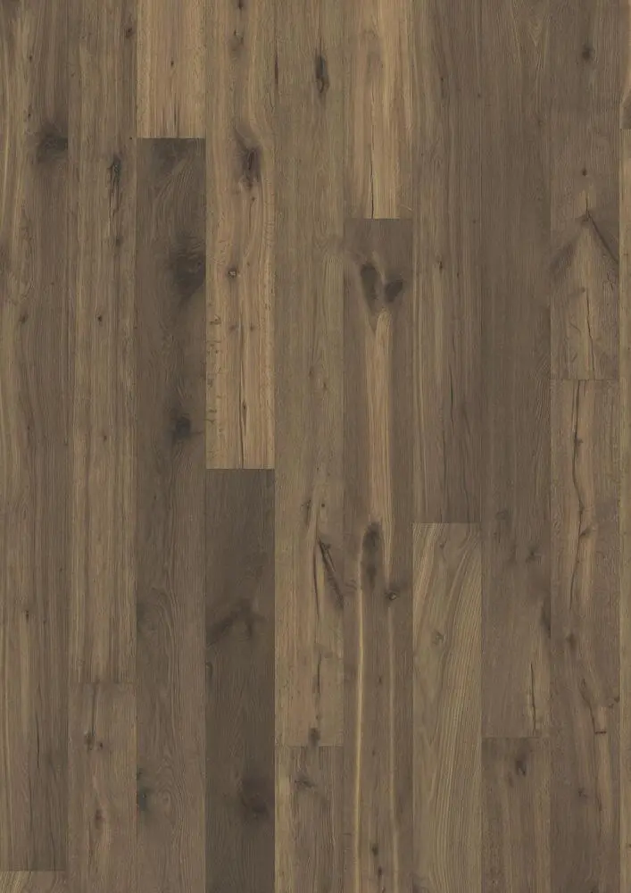 Kanelin vivahdus rikkoontuu syvänharmaan syykuvion myötä tässä Boardwalk Collection -kokoelman 1-lankkuisessa tammilattiossa. Jokainen lauta on käsiharjattu korostamaan syykuviota ja tuomaan esiin runsasta solmujen jakautumaa. Viisteet kaikilla neljällä sivulla luovat klassisen täyslankkuisen ilmeen.
