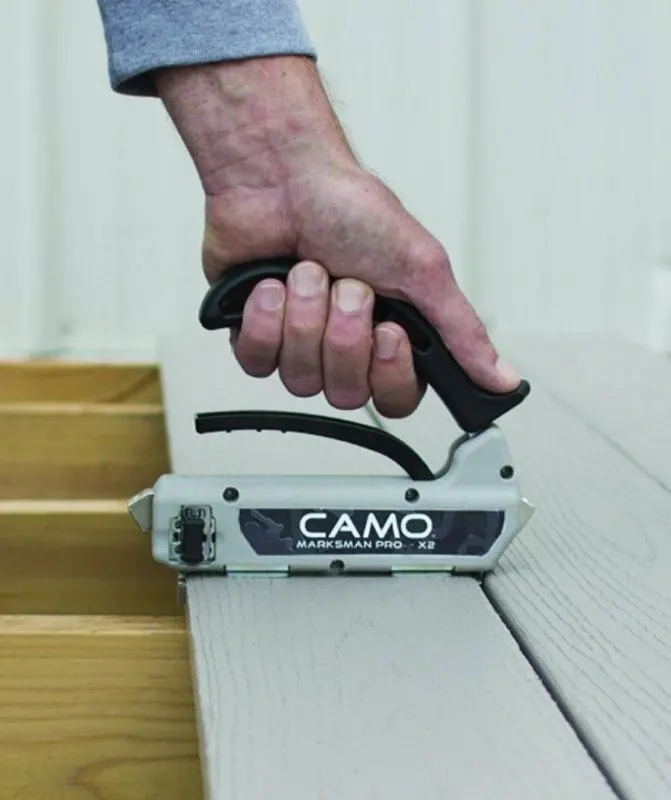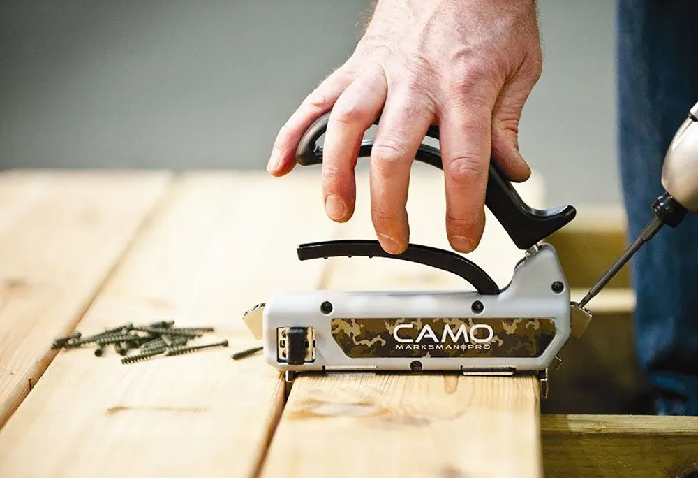 CAMO Marksman Pro - NB 3,2. Det revolutionerede og brugervenlige monteringsværktøj/fastgørelsesværktøj, som gør det muligt, at montere terrassebrædder uden synlige skruehuller. De special-designede CAMO skruer, CAMO Hidden Fasteners, placeres i værktøjets kamre og skrues herefter ind i terrassebrættes sider.  Afstandsklodserne på værktøjets underside, giver automatisk 3,2 mm. mellem hvert bræt. CAMO Marksman Pro - NB, er designet ergonomisk korrekt, og gør det nemt og enkelt at lægge et flot terrassegulv uden synlige skruehuller. CAMO Marksman Pro - NB kan kun anvendes med de originale special-udviklede skruer CAMO Hidden Fasteners.