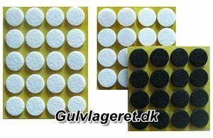 Itsekiinnittyvät huopatyynyt valkoisina tai mustina, asennettaviksi tuolien jalkojen ja muiden vastaavien alle.
