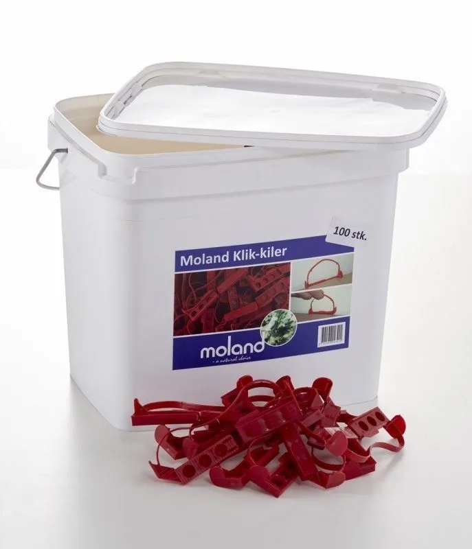 Moland Klik-kiler on ämpäri, jossa on 100 muovista klik-kiilaa. Nämä klik-kiilat ovat ihanteellisia pitämään tasaisen raon lattiasi ympärillä asennuksen aikana. Jokainen kiila koostuu kahdesta osasta, jotka napsahtavat helposti yhteen, mikä mahdollistaa säädettävyyden ja tekee yhtenäisen raon ylläpitämisestä helppoa lattian reunoilla.