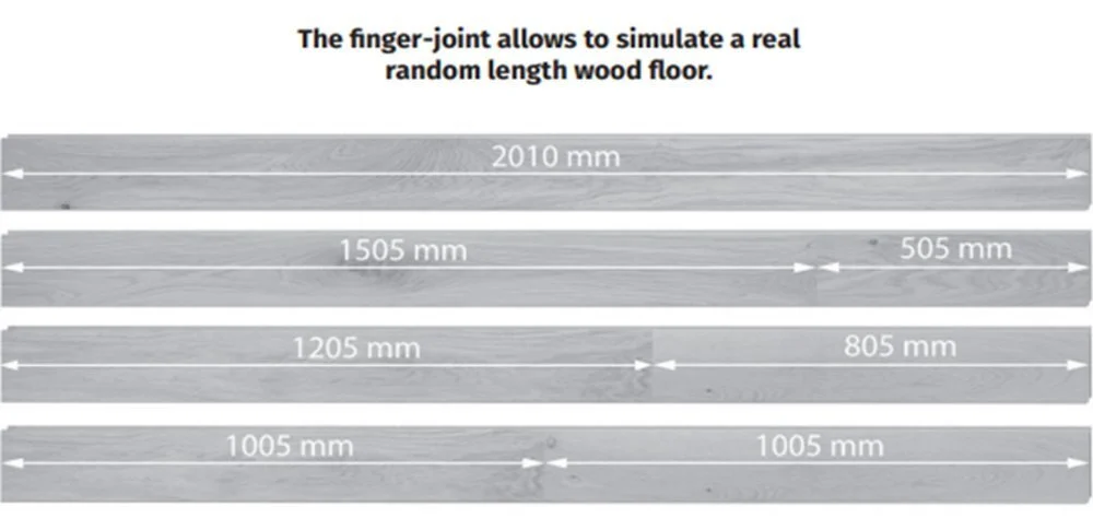 Sisältö per paketti: 1,85 m², 5 lautaa - Laudat toimitetaan sormijatkellulla pintakerroksella, katso kuvitus kuvista. Sormijatkenta mahdollistaa aidon puulattian simuloinnin satunnaisilla laudanpituuksilla.