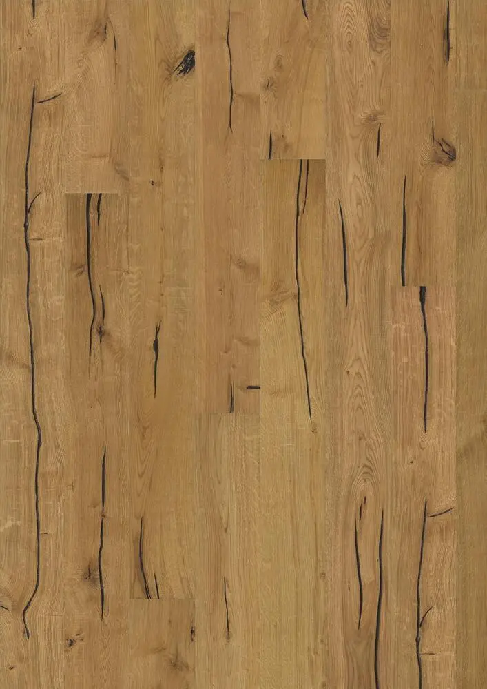 Finnveden, on erittäin rustiikkinen lattia, jossa on solmuja, halkeamia ja täytteitä. Eloisat luonnolliset sävyt, joissa on meripihkan ja hunajan vivahteita.