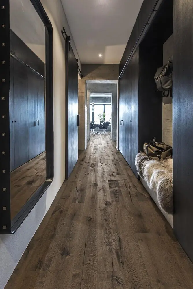 Tveta, tummia vivahteita hiilen sävyissä ja lämpimän sävyn alleliekki. Tveta on erittäin rustiikkinen lattia, jossa on solmuja ja halkeamia.