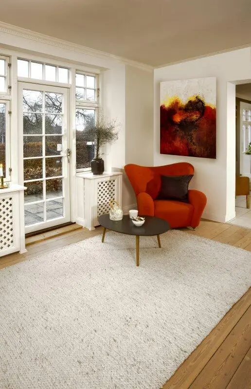 Tyylikäs, tanskalaisella muotoilulla oleva matto, valmistettu villasta ja puuvillasta.